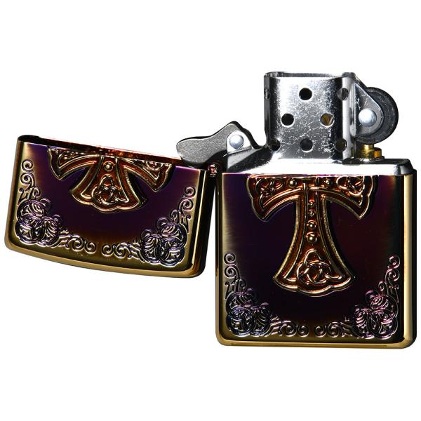 角に施されたエッチング加工と、中央に配置したクロスメタルが印象的なZIPPO。立体的なメタルパーツは、高級感があり、ギフトにもおすすめです。