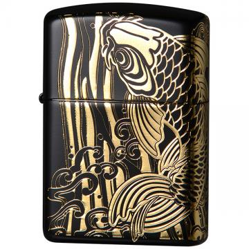 縁起が良いとされている鯉の滝登りをイメージしたデザインが2面に渡り施された逸品。マットブラックのボディに金色の鯉が映え存在感を際立たせています。