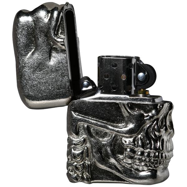 ZIPPO全体をスカルモチーフのメタルジャケットで包みました。飾っておいても持ち歩いても存在感を放つデザインで、高級感と重厚感があふれる逸品。ドクロのくぼみが指にフィットして開閉しやすい、嬉しい実用的な一面もあります。