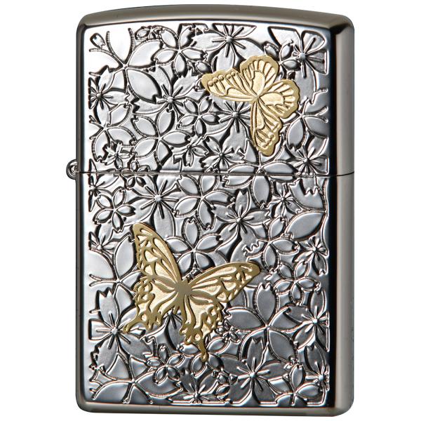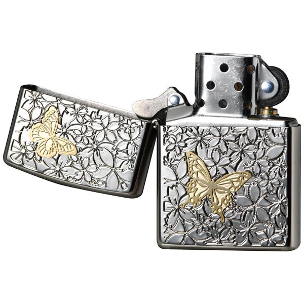 繊細な桜の花柄を背景に、ゴールドの量が優雅に舞うZippoライター。