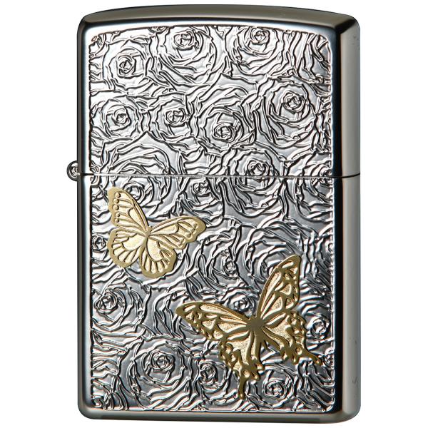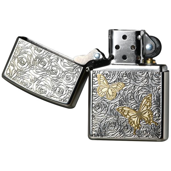 繊細な薔薇の花柄を背景に、ゴールドの量が優雅に舞うZippoライター。シルバーとゴールドのコントラストが、洗練された上品さを演出します。