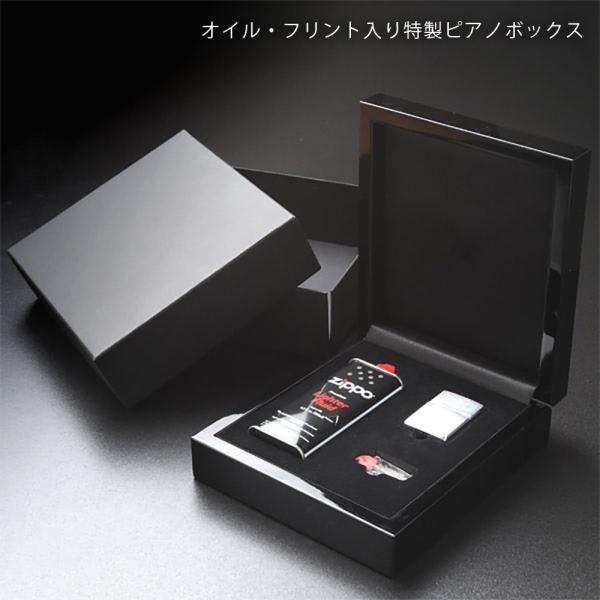 ライターとZIPPOオイル・フリントをセットになった当ショップ限定の特製ギフトボックスにお入れしてお届けいたします。高級感あふれる質感と、ピアノのように光沢のある漆黒の輝きは、まさにスペシャルなボックスです。