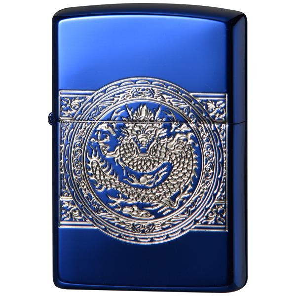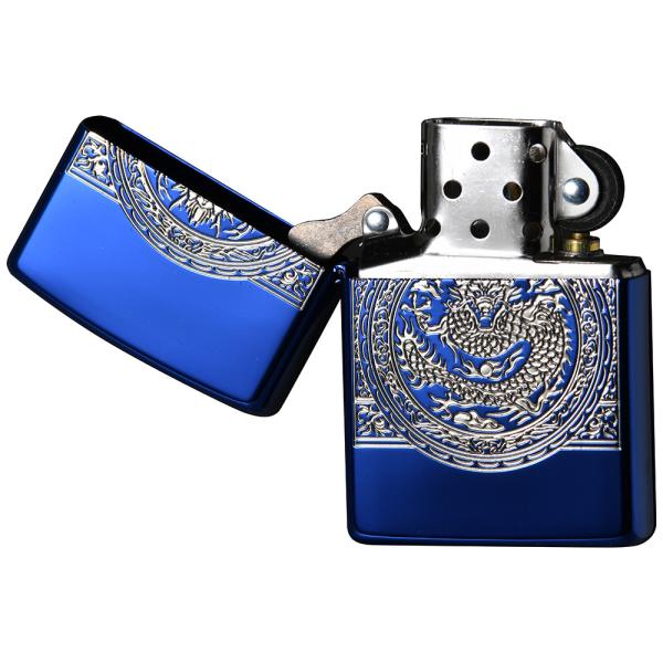 鮮やかなイオンブルーコーティングのライターに、迫力ある金の龍が彫刻されています。